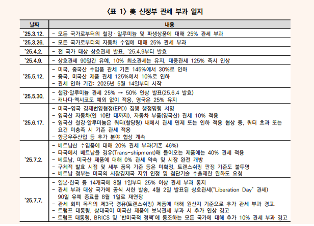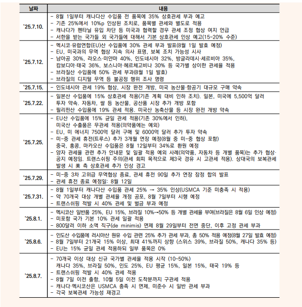 최근 글로벌 공급망은 트럼프 신정부의 관세정책을 기점으로 구조적 전환의 압력에 직면해 있다. 트럼프 행정부의 무역정책은 단순한 무역전략 변경을 넘어, 세계 공급망 구조를 미국 중심으로 재편하려는 분명한 의지로 해석된다. 실제로 2025.4월, 트럼프 미국 대통령은 ‘미국 해방의 날(Liberation Day)’를 선언하고, 전 세계 수입품에 최소 10%의 관세를 일괄적으로 부과하는 동시에 무역적자국에 대해서는 최대 50%(중국 제외)의 고율 상호관세(Reciprocal Tariffs)를 적극적으로 도입하겠다고 발표했다. 특히 중국의 경우, 대미 무역적자와 펜타닐 문제 등을 이유로 3.4일에는 20%의 추가 관세가 부과된 데 이어 4.10일에는 125%의 추가 관세가 더해지면서 총 145%에 달하는 역대 최고 수준의 관세가 적용되며 미·중 간 무역 갈등이 더욱 격화되었다. 또한, 구리, 자동차, 철강·알루미늄 등 전략적 품목도 주요 타겟이 되었으며, 약 4개월간의 관세 협상 이후 70여 개국에 차등적 상호관세가 적용됨에 따라 글로벌 공급망에 큰 변동이 일어날 것으로 예상된다. 미 신정부가 발표한 관세 관련 주요 내용과 주요국에 부과된 상호관세를 정리하면 다음과 같다