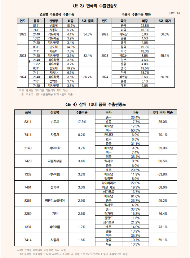 트럼프 2기 행정부는 ‘Make America Great Again’ 기조 아래 보호무역주의와 경제민족주의를 앞세워 통상정책의 방향을 크게 전환하고 있다. 제조업 부흥과 국내 고용 창출을 목표로, 리쇼어링과 글로벌 기업의 미국 내 투자 확대 정책을 적극적으로 추진 중이며26) 타국과의 무역수지 적자를 구조적 불공정의 결과로 인식하여 상호관세율 산정 과정에서 미국은 개별 품목의 세부 경쟁구조나 비관세장벽의 실질적 영향보다는 무역수지 적자 규모에 근거해 관세율을 결정하고 있다27). 이는 美 정부가 무역수지의 결과를 단순히 글로벌 분업구조나 가격 경쟁력의 차이로 보기보다, 상대국의 ‘비상호적 무역조치’와 비관세장벽(높은 관세율, 부가가치세, 기술규제, 보조금 등)에 의한 불공정 경쟁 때문으로 판단하고 있음을 보여준다. 이러한 관세정책에 대하여 美 정부는 무역적자 해소와 자국 산업 보호, 더 나아가 안보 리스크 대응이라는 다목적 수단임을 명확히 하고 있다. 트럼프 행정부는 무역적자를 국가안보에 대한 위협으로 간주하며 국제비상 경제권법(IEEPA)을 근거로 관세 부과의 정당성을 내세웠다. 특히, 트럼프 2기 정부는 관세를 단순한 통상정책만이 아니라, 제조업 리쇼어링 유도와 전략산업 내재화를 위한 정치·경제적 수단으로 적극적으로 활용하고 있다. 이러한 정책은 미국 내 제조업 부흥과 고용 창출을 실현하는 동시에, 외국기업의 미국 내 생산 유인과 공급망의 ‘미국 중심’ 재편을 목표로 한다. 이 과정에서 리쇼어링 및 FDI 정책의 효과, 주요국의 대응, 그리고 글로벌 경제·산업계의 급변하는 환경 속에서 미국의 행보는 앞으로 글로벌 무역 질서와 공급망 구조에 광범위한 영향을 미칠 것으로 전망된다. 이러한 국제 무역 환경의 변화 속에서 최근 한국의 수출 구조를 살펴보면, 특정 국가·품목에 대한 의존도가 주요국에 비해 높다는 점이 특징으로 나타난다. 2024년 기준 상위 5대 수출국에 대한 비중은 56.8%, 상위 5대 수출품목에 대한 비중은 36.7%에 달하며 이는 주요 교역국들과 비교했을 때 상대적으로 높은 수준으로 나타나28) 한국 경제의 무역 기반이 소수의 국가와 산업에 지나치게 집중되어 있음을 보여준다. 국가별로는 중국(19.5%), 미국(18.7%), 베트남(8.5%)이 한국의 3대 수출국으로, 이들 세 나라가 전체 수출에서 차지하는 비중은 무려 46.7%에 이른다. 사실상 절반에 가까운 수출이 소수 국가에 편중되어 있다고 볼 수 있다. 품목별로 살펴보아도 반도체, 자동차 등이 대표 품목으로, 특히 반도체와 자동차·부품을 합친 두 산업의 총 비중은 2024년 기준 29.8%를 차지하고 있다. 품목별 수출국 비중을 살펴보면 반도체 단일 품목은 상위 5대 시장 집중도가 85%를 넘어서는 압도적 의존도를 보이며, 자동차 산업 역시 60% 이상으로 높게 나타나고 있다. 전체적으로 수출 상위 10대 품목의 시장 집중도는 상위 5대 국가 기준으로 최소 59% 이상에 이르는 것으로 분석된다.