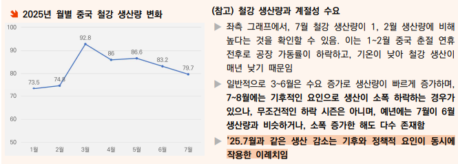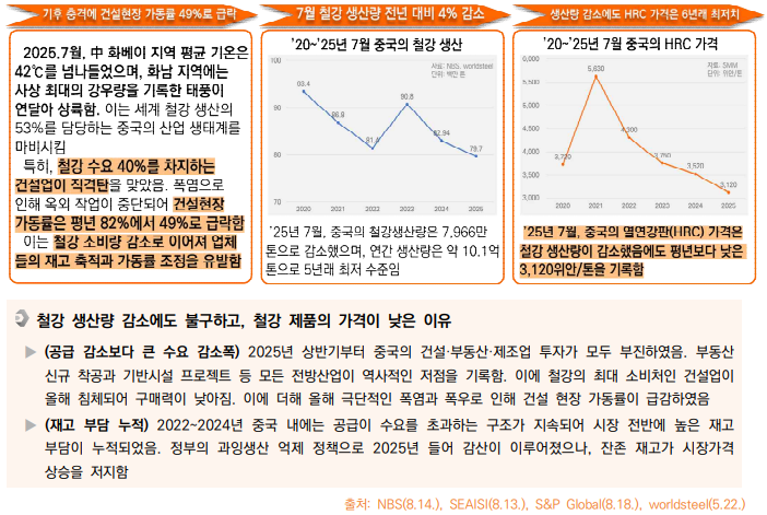o ’25.7월 철강 생산량의 이례적인 감소는 올해 중국에 도래한 극한기후로 인해 건설 현장 가동률이 평년보다 33%p 하락하여 철강 소비량이 급감해 생산업체의 가동률 조정이 이루어졌기 때문임