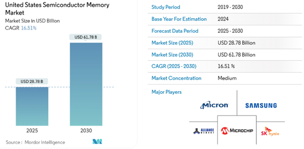 미국 메모리 반도체 시장 규모는, Mordor Intelligence가 2024년 7월 발표한 보고서에 따르면 2025년 약 287억 8천만 달러에 이를 것으로 추정되며, 2030년에는 약 617억 8천만 달러에 달할 것으로 예상된다 (2025년부터 2030년까지 CAGR 16.5%). DRAM이 약 51%의 시장 점유율로 가장 큰 비중을 차지하고, 그 뒤를 이어 NAND 플래시 메모리가 약 30%, SRAM과 MRAM이 약 12%, 기타 메모리 제품이 약 7%를 차지한다.