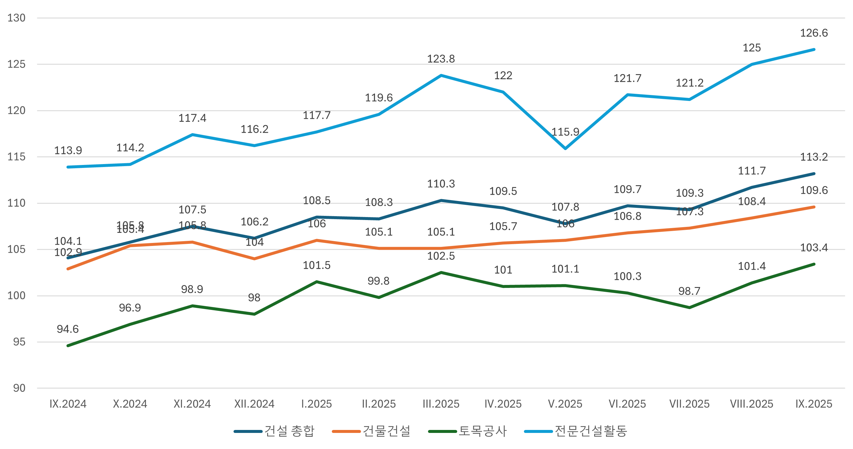 건설 현장에서 실제로 일한 시간으로 산출하는 건설업생산지수(Construction Production Index)는 계절조정지수 기준으로 2021년을 100이라고 할 때, 2025년 9월 전체 건설 생산은 113.2를 기록하며 전년 동월 대비 9.7% 증가했다. 세부적으로 분류해 살펴보면 건물 건설은 109.6(8.2%), 토목공사는 103.4(9.7%), 전문 건설 활동은 126.6(11.4%) 증가해 전 분야에서 성장세가 고르게 나타났다.