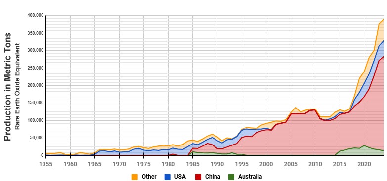 이후 중국이 글로벌 희토류 공급망을 장악하고 자원을 전략적으로 통제하자, 미국은 2010년대 후반부터 국가 안보 차원에서 자급률 제고와 공급망 다변화를 추진하기 시작했다. 2000년대 초반 간헐적으로 생산이 이뤄졌던 미국의 희토류 산업은 2018년 이후 본격적인 회복세를 보였다. 2018년 1만4000메트릭톤에 불과했던 생산량은 2024년 약 4만5000메트릭톤(추정치)으로 늘며, 전 세계 생산량의 14%를 차지해 중국에 이어 두 번째로 많은 규모를 기록했다.