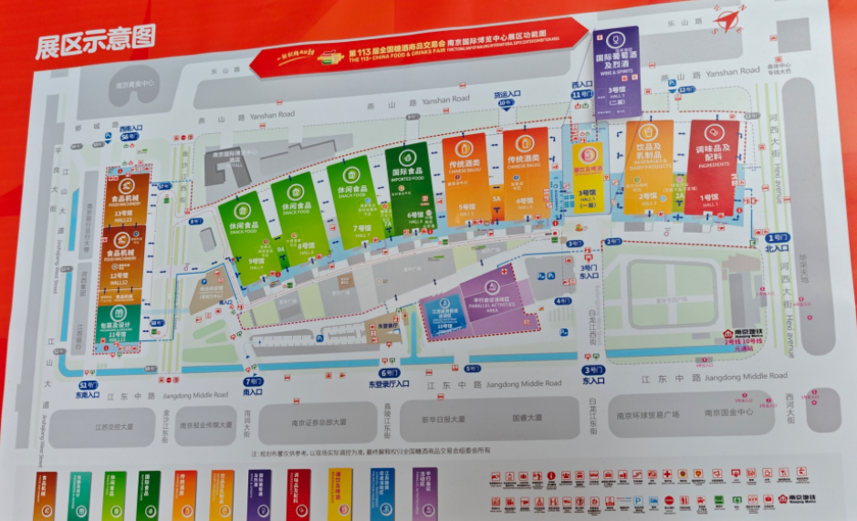 전시는 ▲전통주류 ▲국제 와인·증류주 ▲스낵식품 ▲음료·유제품 ▲국제식품 ▲조미료·식품첨가물 ▲식품기계 ▲포장·디자인 ▲트렌디 주류 및 맥주 ▲장쑤성(江苏省) 투자유치 상담구역 등 10대 주제관과 13개 특별 전시관으로 구성되었으며, 출품 제품 수는 30만 종을 넘어섰다. 이를 통해 식품·주류 산업의 전 가치사슬을 한눈에 조망할 수 있었다.