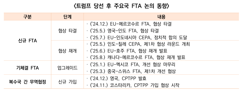 * EU-메르코수르 FTA(’24.12월 타결; 25년 소요), 영국-인도 FTA(’25.5월 타결; 3년 소요), EU-인도네시아 CEPA(’25.7월 타결; 10년 소요)