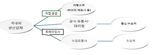 스티렌-부타디엔 고무(SBR)의 유통 구조는 산업적 특성과 구매자의 규모에 따라 ▲직거래 ▲공식 유통망 ▲글로벌 트레이딩을 중심으로 이뤄진다. 대형 타이어 제조사나 글로벌 고무 제품 기업은 국내외 주요 생산업체와 장기 계약을 맺고 직접 제품을 공급받으며, 기술지원과 품질관리까지 포함한 협력체계를 구축하고 있다.