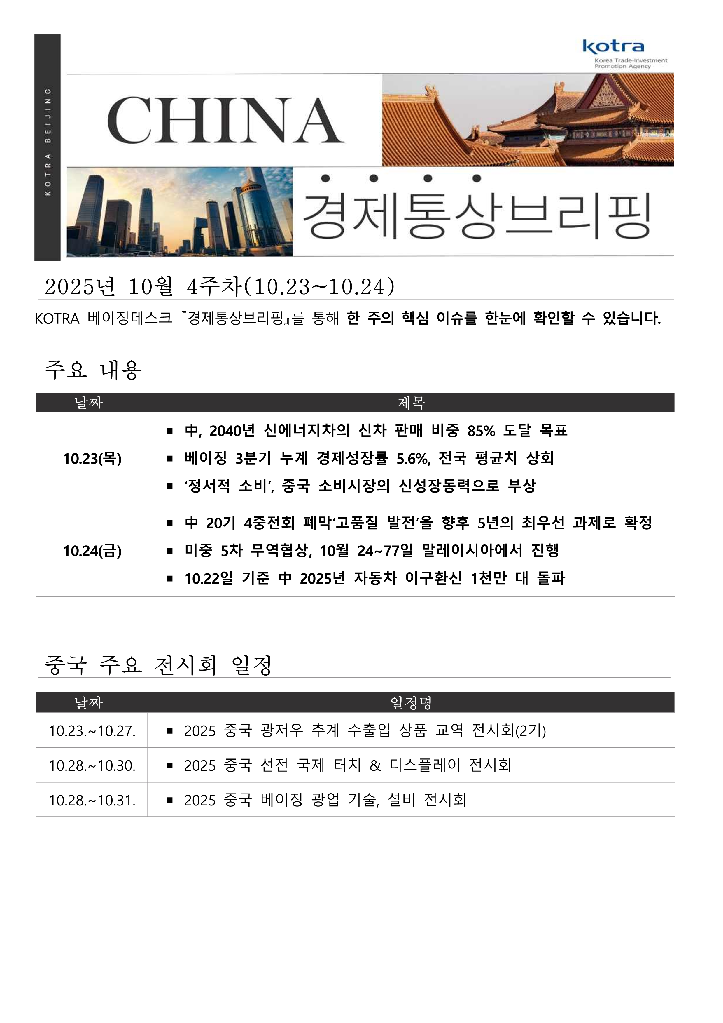 목록 중국 경제통상브리핑 10월 4주차 (10.23.~ 10.24.) 무역관 뉴스레터(구 현지소식) 중국 베이징무역관 2025-10-27 출처 : KOTRA 중국 경제통상브리핑(2025년 10월 4주차).pdf 미리보기 <저작권자 : ⓒ KOTRA & KOTRA 해외시장뉴스> 목록 이전글 [파라과이] 뉴스레터 2025-34호(2025.10.24.) 다음글 일본 경제 브리핑 25-38호 (2025.10.27.) 댓글 0 로그인 후 의견을 남겨주세요. 댓글 입력 0 / 1000 등록