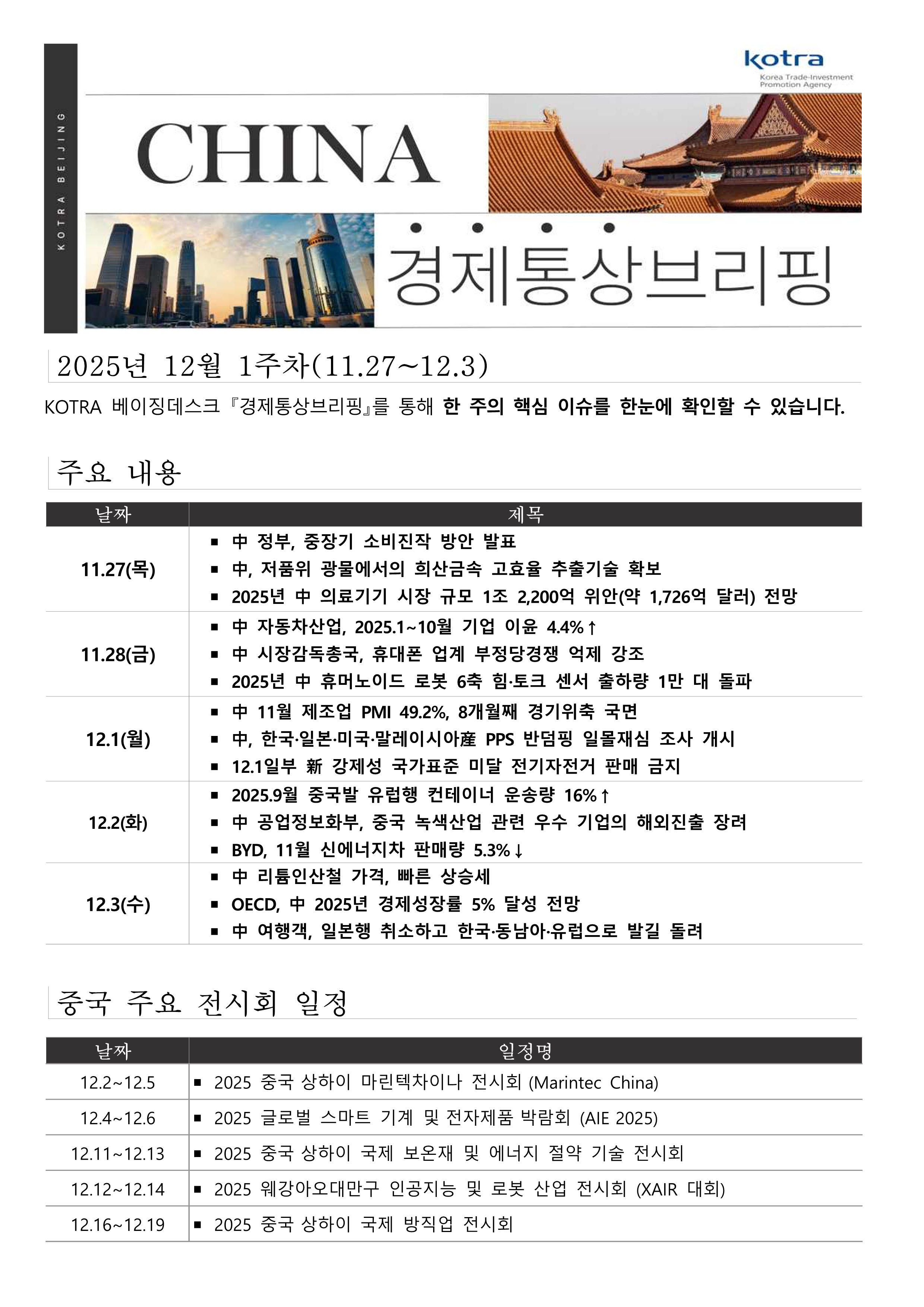 목록 중국 경제통상브리핑 12월 1주차 (11.27.~ 12.3.) 무역관 뉴스레터(구 현지소식) 중국 베이징무역관 2025-12-04 출처 : KOTRA 중국 경제통상브리핑(2025년 12월 1주차).pdf 미리보기 <저작권자 : ⓒ KOTRA & KOTRA 해외시장뉴스> 목록 이전글 KOTRA 워싱턴 D.C. 무역관 - 제25-87호 워싱턴 D.C. 경제통상 브리핑(2025.12.2.) 다음글 EU 경제통상 브리핑 제25-90호 댓글 0 로그인 후 의견을 남겨주세요. 댓글 입력 0 / 1000 등록