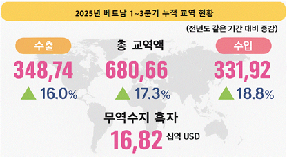 2025년 1~3분기 베트남의 총 교역액은 6806억6000만 달러로, 전년 동기 대비 17.3% 증가했다. 이 중 수출은 3487억4000만 달러(+16.0%), 수입은 3319억2000만 달러(+18.8%)로 모두 두 자릿수 성장률을 기록했다. 무역수지는 168억2000만 달러 흑자를 유지했으나 2024년 동기간(211억 달러 흑자)에 비해 축소된 수치다.