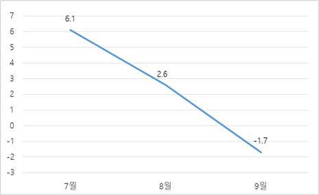 다만 월별 수출 증가율은 7월 +6.1% → 8월 +2.6% → 9월 −1.7%p로 수출 모멘텀이 약화되는 흐름을 보였다. 이는 주요 교역국의 수요 둔화, 제조업 재고 누적, 선적 일정 지연, 원자재 단가 상승으로 인한 단기 경쟁력 약화 등이 복합적으로 작용한 결과로 분석된다.