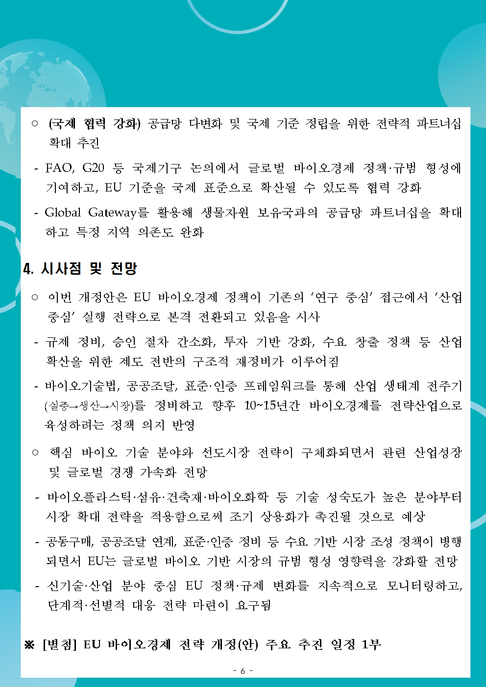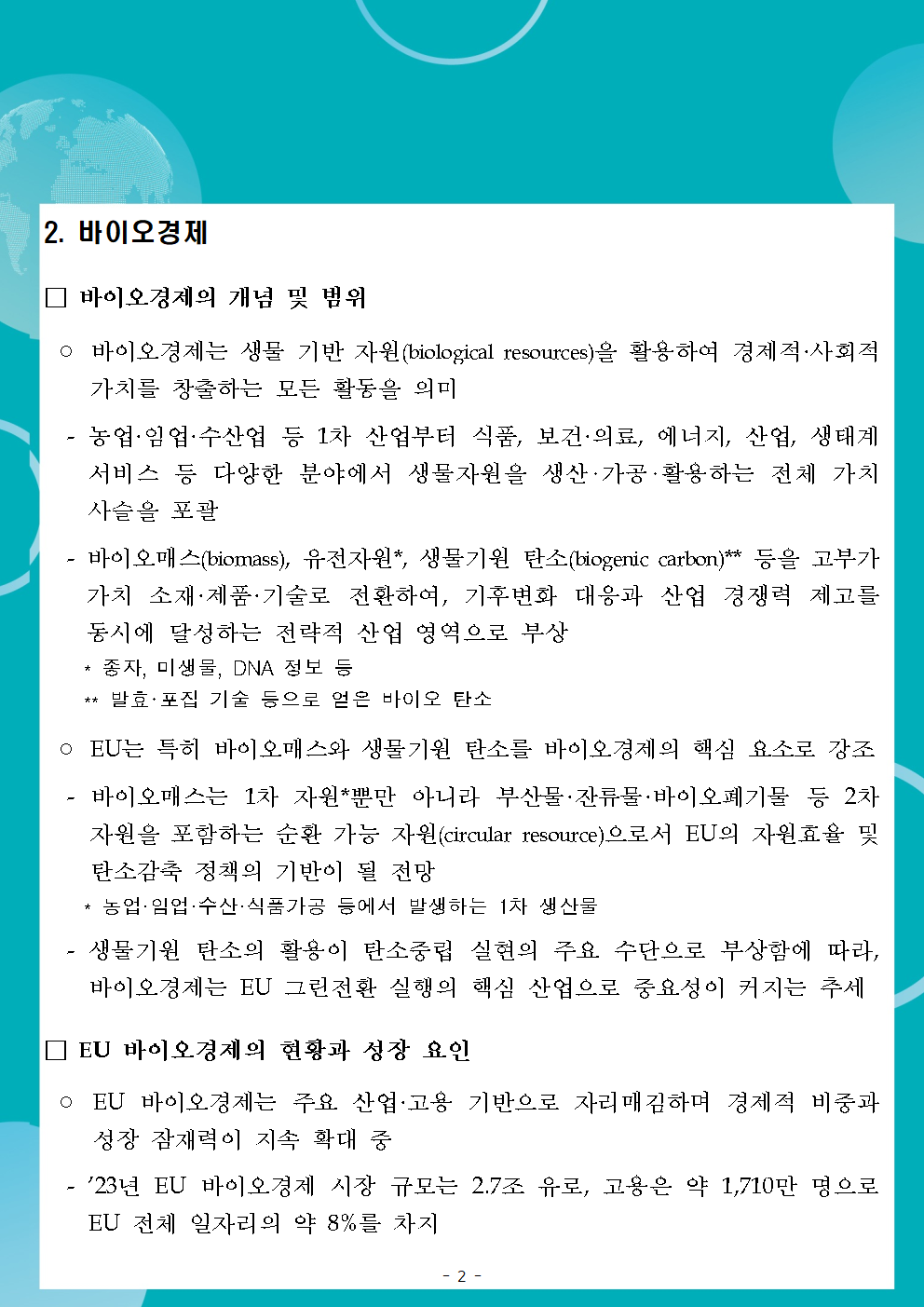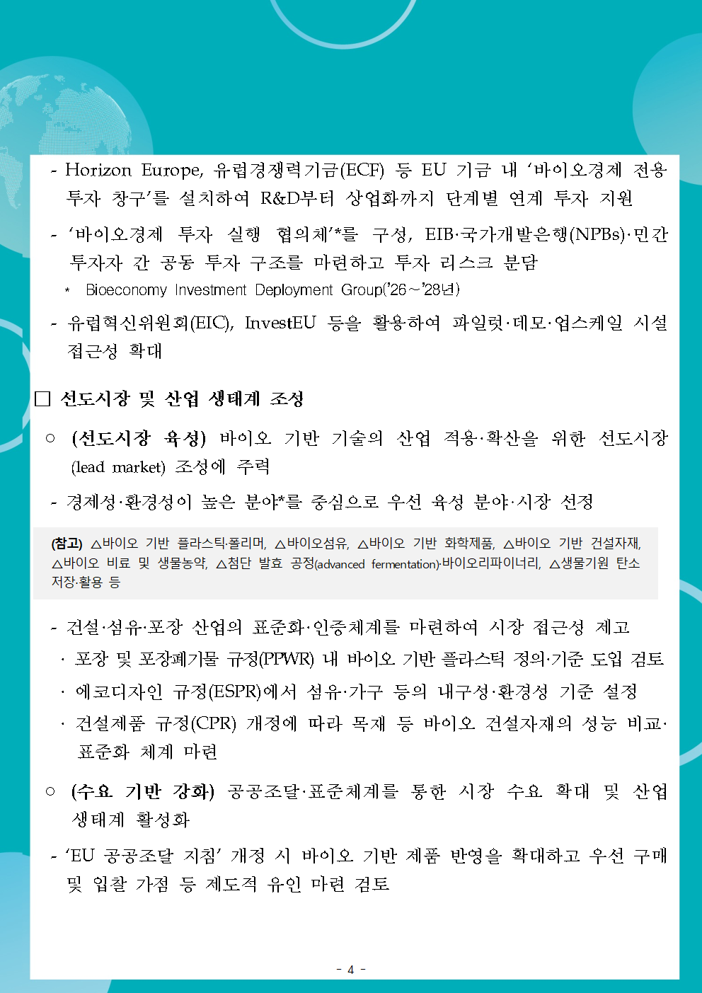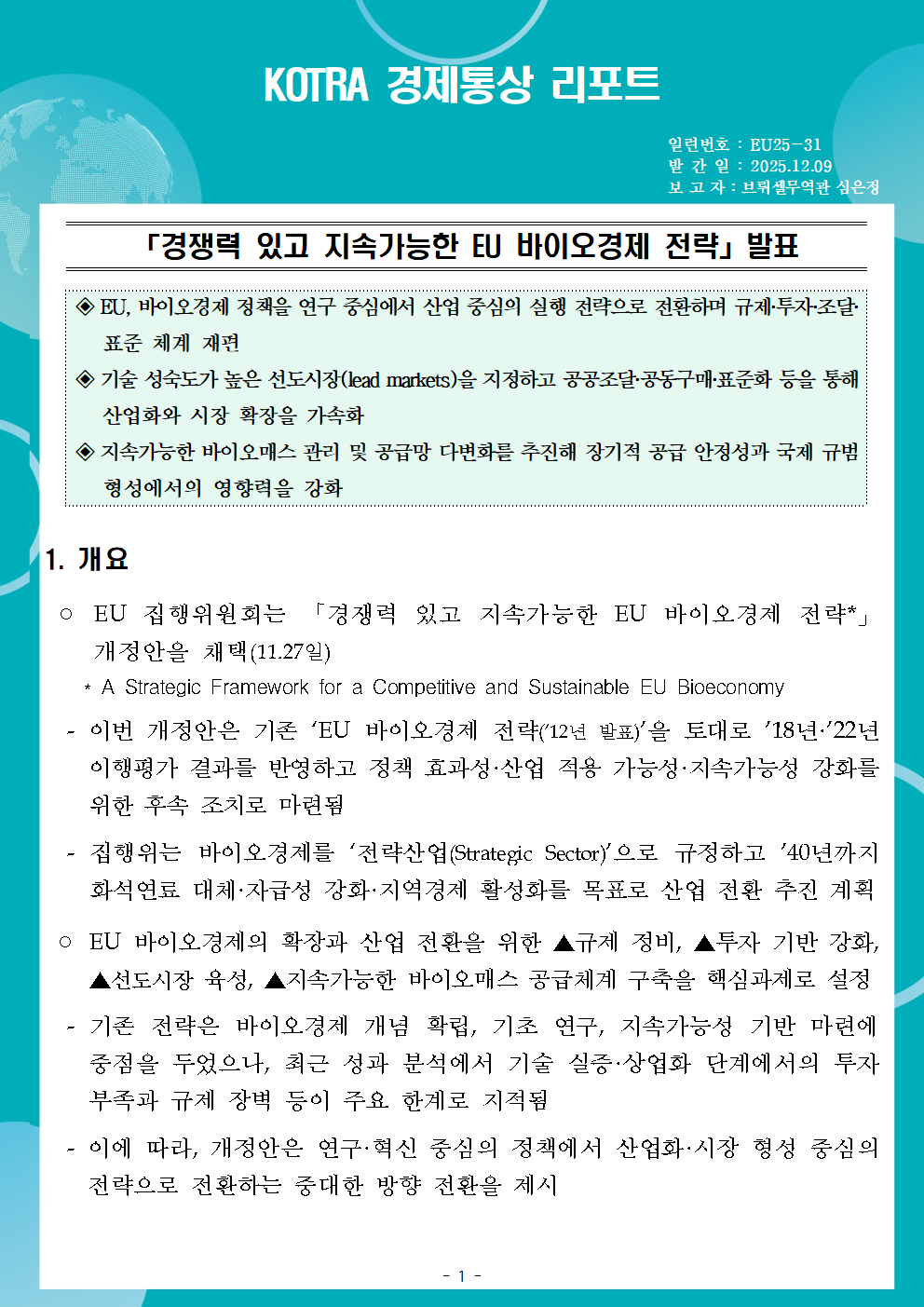 KOTRA의 저작물인 ([EU 경제통상 리포트(25-31)] EU, <경쟁력 있고 지속가능한 EU 바이오경제 전략> 채택(11.27))의 경우 ‘공공누리 제4 유형: 출처표시+상업적 이용금지+변경금지’ 조건에 따라 이용할 수 있습니다. 다만, 사진, 이미지의 경우 제3자에게 저작권이 있으므로 사용할 수 없습니다.