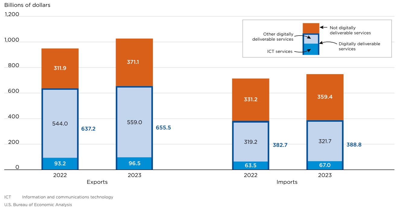 미 경제분석국 발표 기준, 2023년 미국의 디지털 제공 서비스* 수출액은 6555억 달러였으며, 수입액은 3888억 달러로 미국은 디지털 제공 서비스 교역에서 2668억 달러의 흑자를 거뒀다. 미국의 디지털 제공 서비스 수출은 2018년 대비 약 31% 증가하여 같은 기간 미국 전체 서비스 수출이 약 19% 증가한 것을 고려할 때 다른 서비스 부문보다 훨씬 빠른 속도로 성장했다.