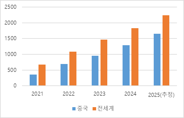 <2021~2025년 중국/전세계 신에너지차 판매량>