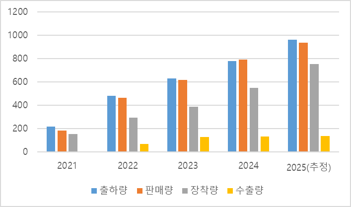 <2021~2025년 중국 리튬이온 배터리 출하/판매/장착/수출량>