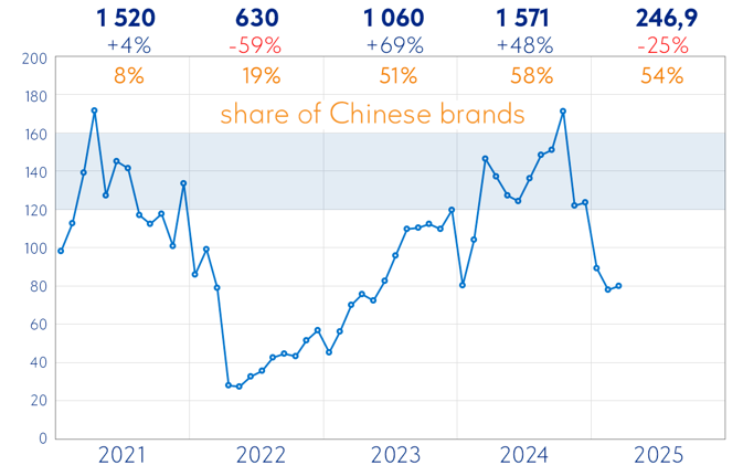 2022년 러우 사태 발발 이후 과도기를 거치고 러시아 자동차 시장은 자체 브랜드 LADA의 성장과 중국 브랜드의 적극적인 진입으로 제재 3년 차였던 2024년, 전년 대비 34.7% 증가한 약 98만 대를 생산했다. 러시아 정부의 자국 자동차 산업 육성 정책에 힘입어 로컬 기업은 큰 성장세를 보였다. 중국 자동차 회사 역시 Haval의 현지 생산 및 Chery, Geely 등 조립 증가 등 적극적인 비즈니스 확장을 추진했다. 그 결과 러시아 자동차 시장에서 중국은 61%(2021년 중국의 비중 8%대), 러시아는 31%를 차지하면서 글로벌 완성차 철수로 공백 상태였던 시장을 빠르게 잠식했다. 하지만 2025년 1분기 러시아 자동차 판매 시장은 전년 동기 대비 -27%를 보이며 급격히 움추러든 모습을 보이고 있다. 2025년은 대외적으로는 러우사태 종식에 대한 기대와 실망이 반복되는 시기이고 내부적으로는 중국 차량에 대한 실망과 대출이자 부담 등에 따른 내수 시장 위축이 원인으로 보인다. 불확실성이 더욱 가중되어가는 러시아 자동차 시장의 현황 및 전망을 살펴보고자 한다.