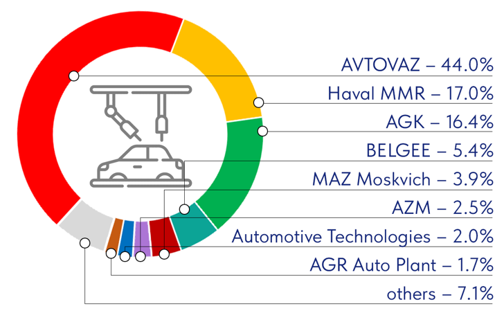 제조사별 생산 비중을 살펴보면 러시아 국민차 LADA를 생산하는 AVTOVAZ가 44%로 압도적인 비중을 차지하고 있다. 그 뒤를 중국 HAVAL 브랜드를 생산하는 MMR에서 17%, 그 외의 중국 자동차 조립 생산 중인 AGK가 16.4% 순이다. 4위를 점하고 있는 BELGEE는 벨라루스와 중국의 합작 생산 법인으로 Geely와 Belgee 모델을 생산하고 있다. 참고로 점유율 1.7%를 보이고 있는 AGR은 2024년 2월 상트페테르부르크 현대차 생산 공장을 인수하여 기존 모델인 Solalis를 생산 중인 기업이다. 2025년 1분기 러시아 자동차 전체 생산량은 전년 동기 대비 12% 증가한 18만 4000대를 생산한 것으로 확인된다. 다만 시장 현황에서 살펴본 바와 같이 생산량은 지속 증가하고 있으나 판매 부진에 따른 재고 증가로 현지 자동차 제조사들의 고민이 깊은 것으로 알려져 있다.