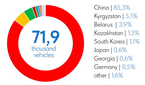 신차 수입 시장을 살펴보면 중국이 85.3%를 차지하면서 수입 점유율 1위를 차지하고 있다. 자동차는 서방의 보이콧 및 일부 제재 동참 국가의 수출 제한 조치 등에 따라 러시아 시장으로의 수출을 공식적으로 중단한 상황인 점을 고려하면 당연한 결과다. 그 뒤로 키르기스스탄 5.1%, 벨라루스 3.9% 순이지만 이들 국가들은 자체 자동차 브랜드를 보유하지 않은 시장으로 유럽, 한국 등의 차량이 병행 수입되는 현상이 수치로 잡힌 것으로 보는 것이 합리적이다.