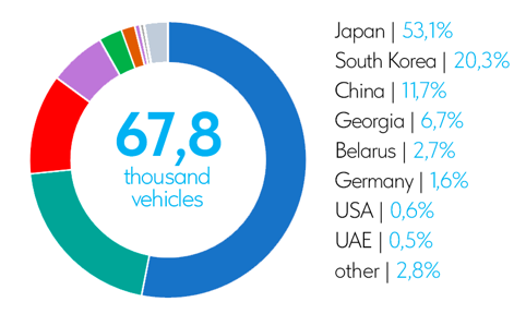 수입국별 비중을 보면 일본이 53.1%로 가장 높은 비중을 차지하고 있다. 하지만 러우사태 이전 일본 중고차가 전체 중고차 수입 비중의 약 90%를 차지하던 과거와 비교하면 그 비중이 많이 낮아졌다. 신차와 달리 중고 자동차 시장은 다변화 양상을 보인다고 할 수 있다. 2024년 11% 비중을 보이던 한국은 현재 20.3%로 급증한 상황이다. 또한 조지아(6.7%), 벨라루스(2.7%)에서 수입되는 차종은 한국 혹은 유럽 브랜드일 가능성이 높을 것으로 보인다. 이는 과거 글로벌 브랜드 충성 고객 니즈가 중고차 시장 다변화를 불러왔다고 분석된다. 참고로 AUTOSTAT 자료에 따르면 2024년 중고차 판매 시장에서 비우호국의 비중은 일본 58%, 유럽 15%, 한국 11.8%, 일본·미국 4%였다.