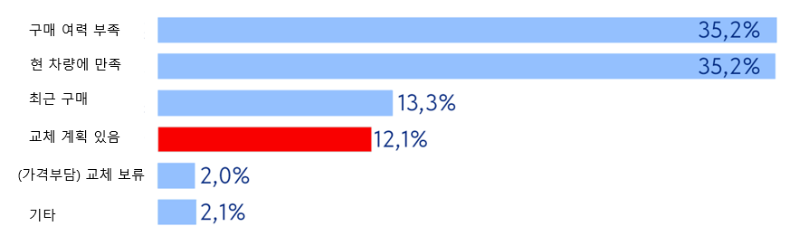 보유 차량 교체 계획에 대해서는 가격 부담 사유를 포함하여 단기 내 교체 의사 없는 경우가 37.2%인 것으로 나타났고 최근 구매했거나 현 차량에 만족한다는 응답자가 48.5%인 것으로 보인다. 전체 응답자 중 12.1%만이 교체 계획이 있다고 응답했다. 교체 계획이 있는 응답자를 대상으로 신차와 중고차 중 구매 희망 질문에서는 중고차 구매 계획이 47.5%로 나타냈다. 최근 보다 다양한 제조사 차량의 선택지가 있는 중고차를 찾는 소비자들이 늘고 있다.