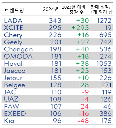 그리고 특이한 점은 최근 러시아의 자동차 딜러샵이 급증하고 있다. 2024년 1월 공식 딜러샵이 3653개였던 반면 2025년 1월엔 4302개로 649개 증가했다. 과거 코로나 발발로 3.2천 개로 그 수가 다소 줄었다가 2023년부터 다시 증가세로 돌아섰다. 2024년 차량 브랜드별로 공식 딜러샵 현황을 살펴보면 아래 표와 같다.