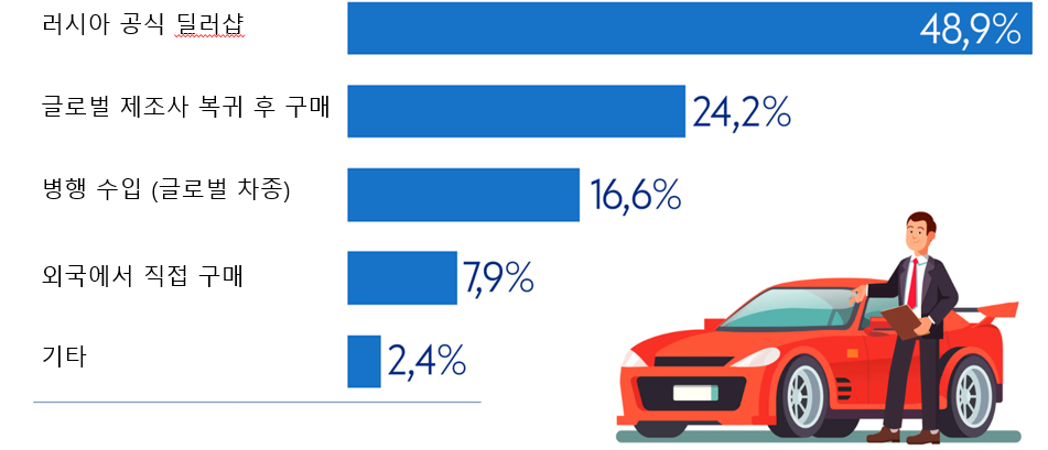다음으로 차량 구매 방법에 대한 생각을 물었다. 러시아에 공식 딜러샵에서 판매되는 차종에 한해 구매하겠다는 응답자가 48.9%였다. 반면 글로벌 제조사 차종 구매를 위해 글로벌 브랜드의 복귀를 기다린다는 응답자가 24.2%, 병행 수입을 통해서라도 구입하겠다는 응답자가 16.6%, 외국에서 직접 구매해오겠다는 응답자가 7.9%로 결과적으로 글로벌 제조사 제품 구매를 희망하는 소비자가 48.7%인 것으로 조사됐다.