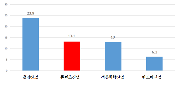 * 주2: 콘텐츠 산업, 반도체 산업은 시장 규모 / 철강 산업, 석유화학 산업은 출하액