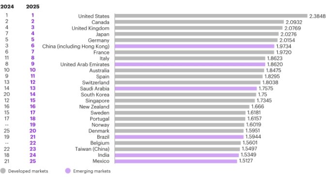 하지만 외국인 투자기업을 대상으로 실시한 조사에서, 중국은 여전히 매력적인 투자처로 평가받고 있다. 최근 글로벌 컨설팅 기업 커니(Kearney)가 향후 3년간 외국인직접투자 흐름에 대한 투자자 심리를 파악하는 설문조사인 ‘2025년 외국인직접투자 신뢰지수(FDICI) 보고서’를 발표했다. 이 보고서에 따르면, 올해 중국은 지속적인 부동산 위기와 미·중 무역 긴장 고조 등 고질적인 경제 문제를 반영해 세계 투자 유망국 중 2024년 3위에서 2025년 6위로 순위가 하락했으나, 눈에 띄는 기술 발전과 탄탄한 경제 기반으로 인해 여전히 핵심적인 매력을 유지하고 있다고 평가된다.