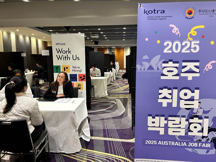 호주 내 한국 청년들의 취업 기회를 넓히기 위해 KOTRA 시드니무역관이 2025년 8월 7일 개최한 ‘2025 호주 취업박람회’가 성황리에 마무리됐다. 주 시드니 총영사관과 공동주최로 개최된 이번 행사에는 금호타이어, 대한항공, NH농협, 씨제이, 포스코, KEB하나은행, 현대로템 등 우리 진출기업과 핀덱스(Findex), 애플잭 호스피탈리티(Applejack Hospitality) 등 호주 현지기업을 합쳐 총 30개사의 구인기업, 그리고 130여 명의 청년 구직자가 참석해 총 80여 개의 채용 직무에 대한 현장 면접이 하루 종일 이어졌다.