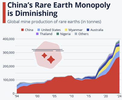 <전 세계 희토류 채굴량 추이 (1994~2024)>