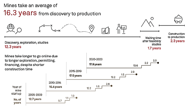 공급망 확대 지연의 배경에는 자원 확보와 기술력 부족 외에도, 인허가 지연과 환경 규제가 복합적으로 작용하고 있다. 시장조사기관 S&P Global은 2000년 이후 상업 생산을 시작한 글로벌 광산 사례를 분석한 결과, 탐사에서 실제 생산까지 평균 16.3년이 소요됐다고 분석했다. 특히 2020~2023년 새로 가동된 광산의 경우 평균 리드타임은 17.9년에 달했으며, 인허가와 착공 전 준비 단계의 비효율이 주된 원인으로 지목됐다.