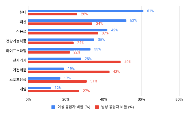 실제로 Satista에 따르면, 여성 소비자는 뷰티, 패션, 식음료, 건강기능식품, 라이프스타일 제품에서 높은 구매 비중을 보였으며, 이는 감성적이고 시각적인 콘텐츠와 밀접하게 연관돼 있다. 반면 남성은 전자기기, 가전제품, 스포츠용품, 게임과 같은 기능 중심 제품군에서 상대적으로 높은 구매율을 기록했다. 이는 유튜브나 페이스북의 제품 리뷰, 언박싱 영상처럼 전문성과 신뢰성을 강조하는 콘텐츠에서 더 큰 반응을 보인다는 점을 보여준다.