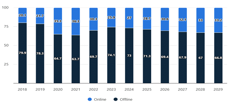 <에콰도르 콘택트렌즈 온라인/오프라인 판매 비율 추이(2018~2029년)>