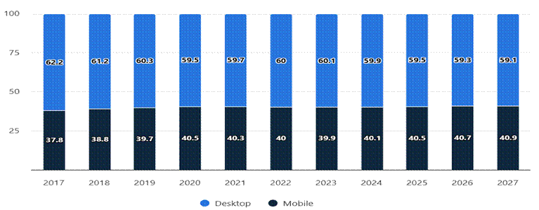 <에콰도르 콘택트렌즈 온라인 판매 중 모바일/데스크탑 비율(2017~2027년)>