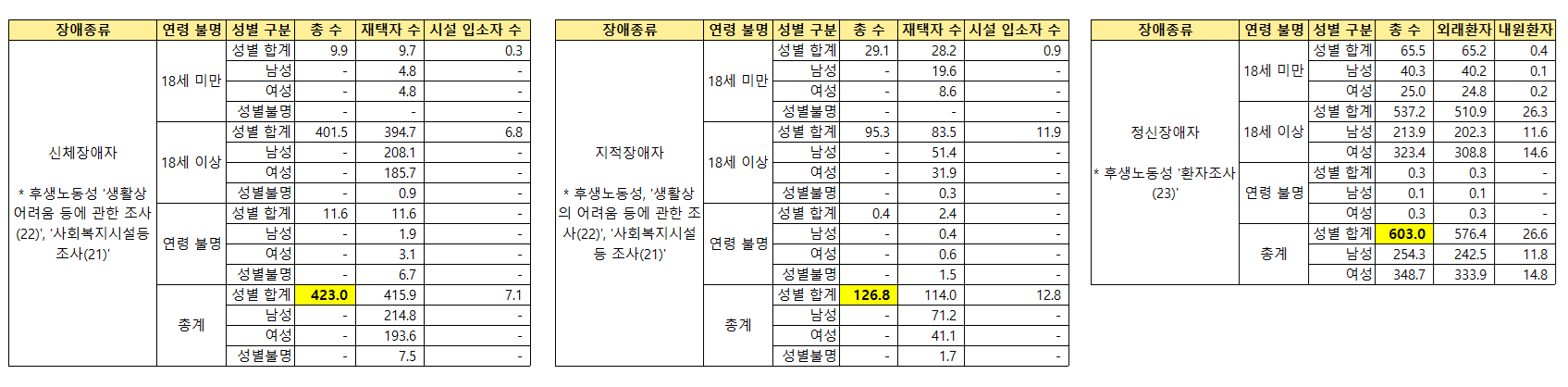 2025년 6월 일본 내각부에서 공표한 레이와 7년 장애인 백서 (令和7年版 障害者白書)에 따르면, 일본 내 장애인 수 추계는 약 1152만 명으로 일본 전체 인구의 9.3%가량을 차지하는 것으로 나타났다. 장애 종류별로 보면 신체장애인은 약 423만 명, 지적장애인은 126만8000명, 정신장애인은 603만 명으로 집계됐다.