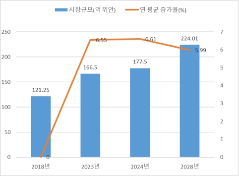 컨설팅 회사인 ‘터우바오 연구원(头豹研究院)’의 데이터에 따르면, 눈 피로 해소 건강식품 시장 규모는 2018년 121억2500만 위안(약 2조3600억 원)에서 2023년 166억5000만 위안(약 3조2400억 원)으로 연평균 6.6% 성장했다. 또한, 2024년 177억5000만 위안(약 3조4500억 원)에서 2028년 224억100만 위안(약 4조7500억 원)까지 성장할 것으로 전망된다.