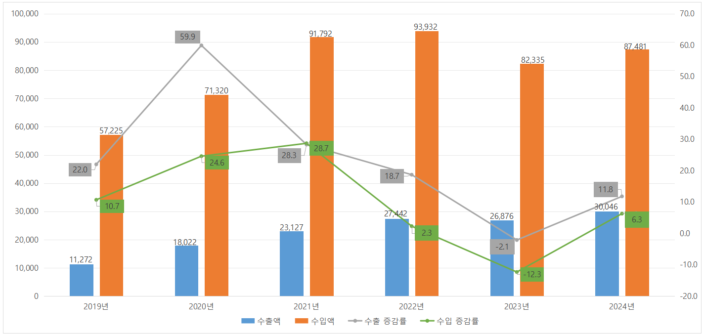 <2019~2024년 중국 디스플레이 구동 칩 수출입액 및 증감률 추이>