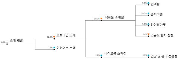 오프라인 소매 중에서는 식료품 소매점이 90.2%로 절대적인 비중을 보였으며, 이 가운데 슈퍼마켓이 28.3%로 가장 큰 판매 채널로 자리 잡고 있다. 이는 베트남 내 중산층 확대와 현대적 유통망 이용 증가에 따른 결과로 해석된다. 한편 편의점·하이퍼마켓·소규모 현지 상점은 각각 5.5% 내외로 비슷한 수준을 보이고 있으나, 최근 추세를 보면 편의점과 하이퍼마켓은 도심 지역을 중심으로 출점이 확대되며 점유율이 점차 증가하고 있다. 반면 소규모 현지 상점은 전통적인 유통 채널임에도 불구하고 현대적 유통망 확산과 소비자의 구매 패턴 변화로 점차 비중이 감소하는 추세다.