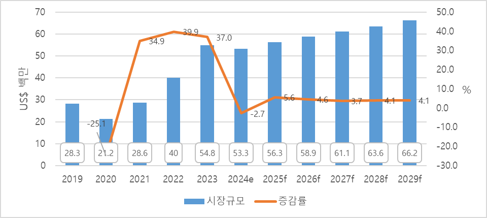 코로나19 팬데믹의 영향으로 2020년 시장 규모는 전년 대비 25.1% 감소한 2120만 달러까지 위축됐으나, 이후 빠른 회복세를 보였다. 2021~2023년 동안 두 자릿수 성장률을 이어가며, 2023년에는 5480만 달러로 전년 대비 37% 급증했다. 다만, 2024년에는 기저효과와 수요 조정으로 전년 대비 2.7% 감소한 약 5330만 달러를 기록하며, 일시적인 조정 국면을 맞이했다. 이후에는 연평균 3~5%대의 안정적인 성장세가 지속될 것으로 전망된다.