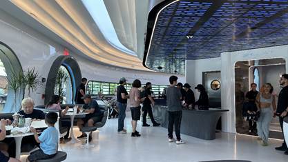 위치는 미국 대중문화의 상징 중 하나인 루트 66인근 7001산타모니카 길이다. 헐리우드 특유의 활발한 관광객 유입과 문화적 상징성을 활용하기에 최적의 입지다. 외관은 사이버트럭에서 착안한 날카로운 각과 스테인리스 스틸 마감으로 만들어졌으며 1950~60년대 미국이 우주 경쟁에 열광하던 ‘스페이스 에이지(Space Age)’ 건축 양식을 현대적으로 재해석했다. 밤이 되면 네온 조명과 건물 곡선이 어우러져 마치 미래형 우주선이 도심에 착륙한 듯한 시각적 임팩트를 준다.