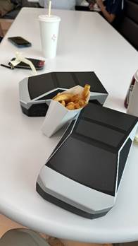 메뉴 구성은 전형적인 미국식 다이너 메뉴를 기반으로 한다. 대표적으로 버거, 감자튀김, 밀크셰이크, 핫도그 등이 있으며, 캘리포니아의 식문화 흐름에 맞춰 대부분의 메뉴에 식물성 대체육 및 비건 옵션을 제공한다. 고객들은 키오스크나 테슬라앱을 통해 간편하게 주문할 수 있고, 음식은 사이브트럭 바스켓 또는 트레이에 제공돼 시각적 재미도 더한다.