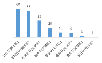 2025년 상반기 새로 오픈한 ‘최초 매장’은 주로 난산구와 푸티엔구에 집중돼 있다. 신규 오픈 매장 중 31.1%에 해당하는 60개 브랜드가 난산구에 있으며, 28.5%의 브랜드는 푸티엔구에 있다. 난산구, 푸티엔구, 바오안구, 뤄후구 등 상위 4개 구가 전체 신규 오픈 매장 수의 88.1%를 차지한다. 이 지역은 주로 쇼핑몰 등 상업시설이 밀집돼 있는 지역이다.