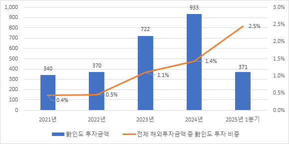 14억 인구 가진 인도는 거대한 소비시장이자, 다변화가 요구되는 글로벌 공급망에서 새로운 거점으로 주목받고 있다. 젊은 중산층의 성장과 디지털 소비 확산, 인도 정부의 제조업 진흥 정책과 인프라 확충 노력으로 다국적 기업의 투자가 가속화되고 있으며, 한국 기업의 대인도 투자도 2021년 이후 꾸준히 증가하는 추세이다.