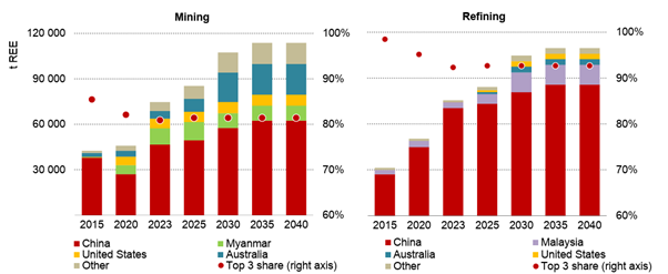 <국가별 희토류 채광 및 정제량, 상위 3개국 점유율 추이>