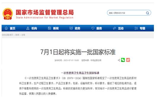 국가시장감독관리총국(国家市场监督管理总局)은 2024년 6월 25일 18개 강제 국가표준 승인 공고를 발표했다. 여기에는 소독 분야 강제 국가표준인 GB 15979-2024 '일회용 위생용품 위생 요구사항(一次性使用卫生用品卫生要求)'(기존 GB 15979-2002 대체)이 포함돼 있으며, 해당 표준은 2025년 7월 1일부터 시행됐다.