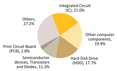 태국 전자제품 산업은 전체 생산량의 약 76% 이상이 해외 시장에서 소비될 만큼 높은 수출 의존도를 보이며, 국가 주요 수출 품목으로서의 입지를 공고히 하고 있다. 품목별로는 집적회로(IC)가 전체 전자 수출의 21.0%를 차지해 가장 큰 비중을 기록했으며, 이어 컴퓨터 및 부품(19.9%), 하드디스크드라이브(HDD, 17.7%), 반도체·트랜지스터·다이오드(11.3%), 인쇄회로기판(PCB, 2.8%) 순으로 나타났다.