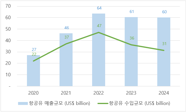 HS코드 2710.19 기준으로 미국의 항공유 수입규모는 2023년 362억 달러에서 2024년 312억 달러로 약 13.9% 감소하며 전반적으로 축소되는 흐름을 보였다. 그러나 국가별로 살펴보면 2023년 대비 2024년 한국은 수입액이 소폭 줄었음에도 수입 점유율은 9.5%에서 10.6%로 확대돼 전체 수입이 줄어드는 가운데 한국산 항공유의 비중이 빠르게 늘어나고 있음을 보여준다. 반대로 이라크, 사우디아라비아, 브라질, 멕시코 등 중동·남미 주요 수출국들의 대미 수출액 감소뿐 아니라 점유율도 축소되고 있어 중동·남미 공급 감소분을 아시아 지역(한국, 싱가포르 등)이 채우는 구조로 보여 한국 기업에는 미국 내 항공유 시장에서 입지를 확대할 기회로 보인다.