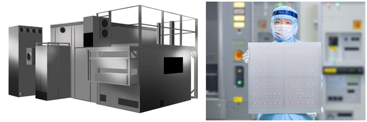 <1.0 마이크로미터의 고해상도와 600mm 사각 대형 기판 대응의 'DSP-100'(왼쪽), 노출된 기판(오른쪽)>
