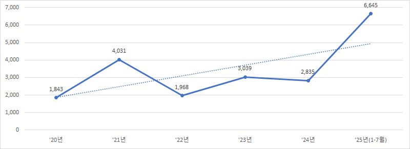 글로벌 트레이드 아틀라스(Global Trade Atlas, GTA)에 따르면, 지난 3년간 총수입은 크게 확대돼 3배 이상 성장했다. 2025년 상반기 수입액 기준으로 살펴보면 연말까지 전년도 수준을 유지하거나 웃돌 가능성이 높다. 전체 의약품 수입으로는 소규모 시장이지만 급격히 성장하는 품목군으로 평가된다. 특히, 동 품목에 있어서는 유일하게 한국이 2023년부터 1위 자리를 지키고 있다. 2024년 기준으로 전체 수입의 73.1%를 차지, 2위 대만에 비해서도 3배 이상을 앞서는 압도적인 공급을 자랑하고 있다. 다만, 2024년에는 전년도 대비 대만으로부터의 수입이 10.7%를 증가할 만큼 바짝 뒤쫓아 오면서 한국과 대만의 양강 체제가 당분간 지속될 것으로 분석된다.