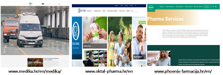 Phoenix Farmacija는 2004년 독일 Phoenix 그룹이 Medifarm-Velebit과 Farmacija를 인수·합병하면서 설립된 법인으로, 현재 약 24%의 시장 점유율을 차지한다. 처방 약, OTC, 건강보조제, 의료기기, 화장품을 자그레브, 오시예크, 리예카, 솔린 등 전국 5개 물류센터를 통해 공급한다. 특히 콜드체인 물류와 긴급·특수 수입에 강점이 있어 다국적 제약사들의 주요 파트너로 꼽힌다. 또한 HALMED와 협력해 등록되지 않은 의약품을 긴급 수입·공급할 수 있는 역량도 확보하고 있다.