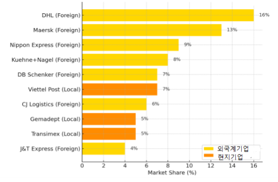 이외에도 Dai Tan Logistics(3.9%), NPL Logistics(3.5%), Gemadept(3.0%), Viettel Post(2.5%) 등이 주요 기업으로 활동하고 있다. 이들 상위 10개 기업의 합산 점유율은 약 46.2%로, 시장은 글로벌 기업과 현지 대기업이 주도하는 가운데 한국 기업도 상위권에 포함되며 점차 입지를 넓혀가고 있다.