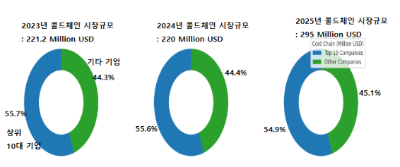 베트남 콜드체인 시장은 식품, 농수산물, 의약품 등 다양한 산업의 수요 증가에 힘입어 빠르게 성장하고 있다. TechSci Research에 따르면 2023년 시장 규모는 약 2억1120만 달러였으며, 2024년에는 2억200만 달러로 집계됐다. 2025년에는 다시 반등해 약 2억9500만 달러에 이를 것으로 전망된다. 시장 구조는 상위 10대 기업이 전체의 약 44~45%를 차지하고, 나머지는 다수의 중소기업이 분담하는 형태다.